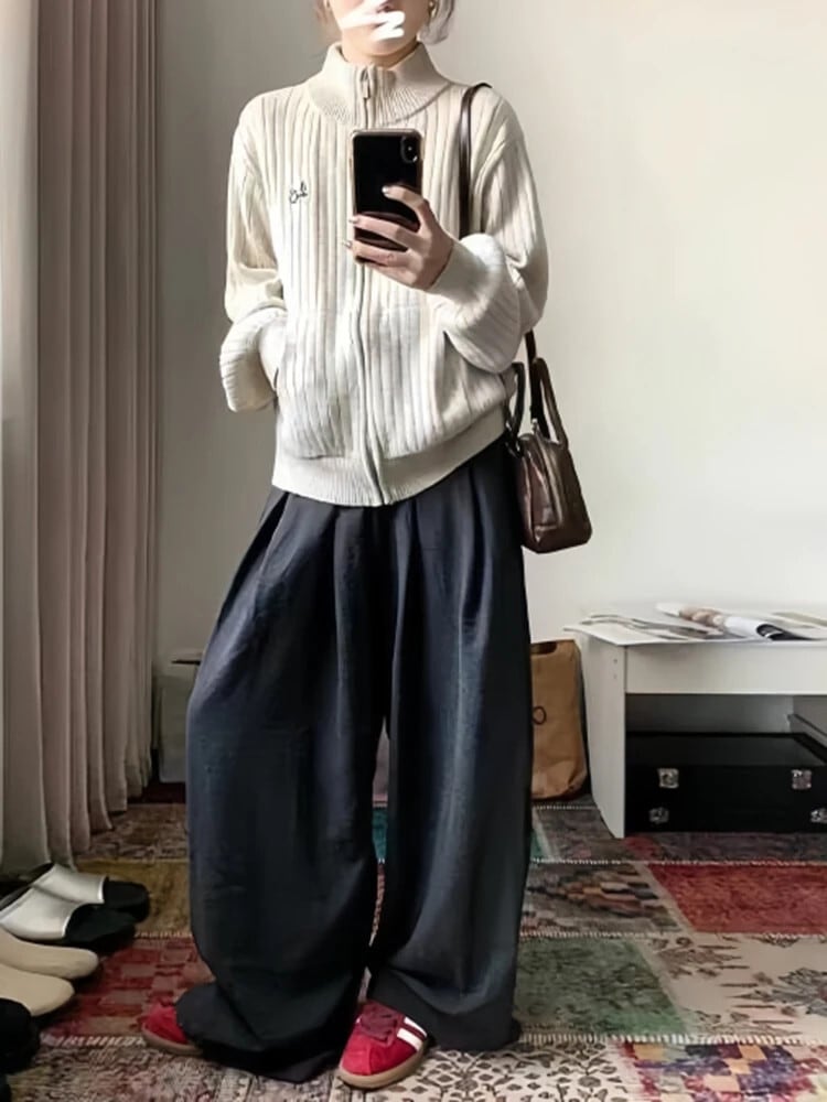 Zwei Stück Herbst Winter Schlanke Frauen ホースセット Einfarbig Einfache Grundlegende Frau ホースセット Beiläufige Lose Straße Breite Bein Hosen Weibliche ウィンター 冬物 | onion